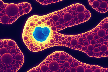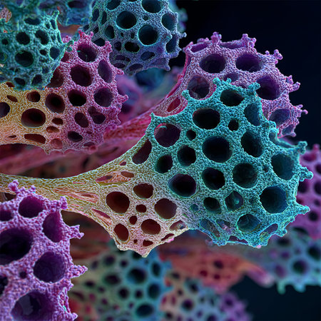 Vibrant, multicolored cells with unique shapes are arranged closely together, illustrating the beauty of microscopic life under a detailed scientific examination.