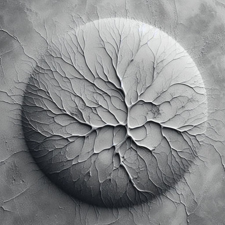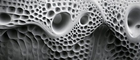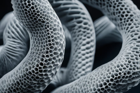 A high-resolution, monochrome micrograph of an intricate network of fibers in the skin resembling flowing water on the dark background. Generated by artificial intelligence.