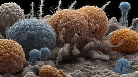 Close examination shows various cell types with striking color contrasts, highlighting their unique structures and textures in a biological context.