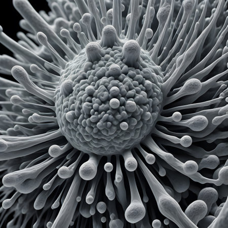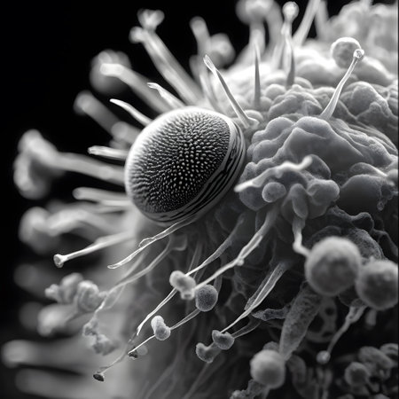 This close-up image depicts cancer cells under laboratory equipment, showcasing intricate details for medical analysis and health research. Ideal for educational use.
