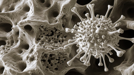 A virus magnified under a microscope, showing the complex details of its structure, ideal for illustrating medical and health concepts