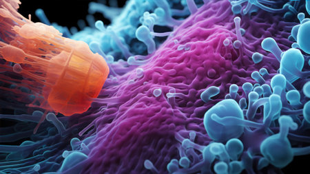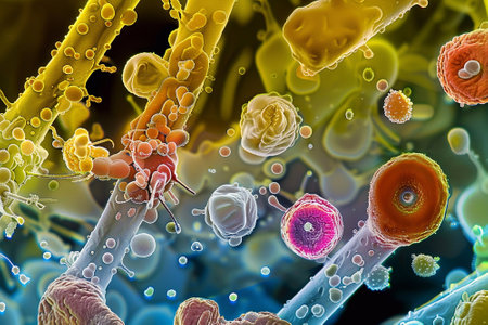 This detailed view shows various microorganisms interacting within a vibrant cellular environment