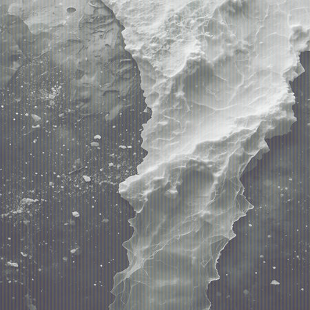 An abstract close-up of ice and frozen water, showing intricate textures, cracks, and small frozen particles against a darker background.