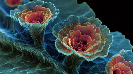 This close-up reveals a stunning variety of cells and structures with unique textures and vivid colors, highlighting their complexity.