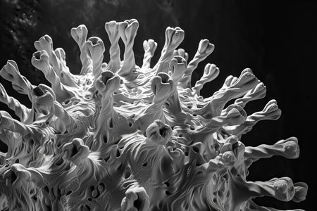 A grayscale depiction of the sars-cov- virus set against a black background. the texture and shape of each strand is meticulously to showcase its unique characteristics. high contrast lighting highlights details for depth and clarity in every pixel.