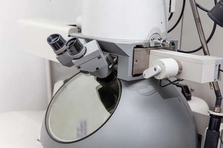 Laboratory equipment optical microscope, closeup of scientific microscope with metal lens, data analysis in the laboratory