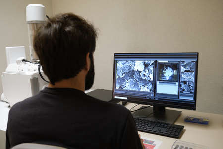 Young man scientist working with scanning electron microscope. Laboratory technician observing samples with a SEM.