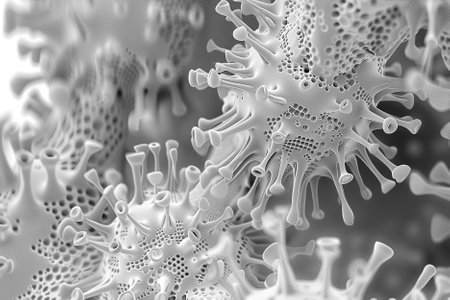 A detailed look at bacteria and particles interacting under high magnification in black and white