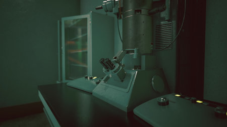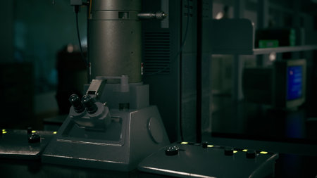 Exploring the intricate details of science, a sophisticated microscope stands ready for research in a dimly lit lab. The atmosphere is quiet, filled with anticipation of discovery.