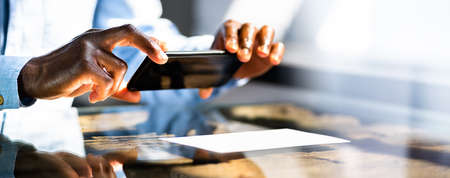 Picture of modern mobile phone in woman arms above the table in office