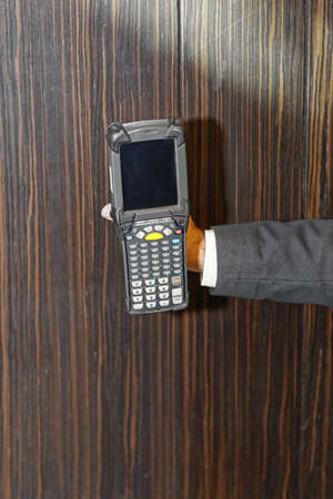 Data collection terminal. Data collection terminal in hand. Terminal is portable. Portable device for warehouse worker. Electronic equipment for a warehouse. Modern barcode reader.