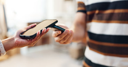 NFC technology. Customer is paying. Close up of guest using smart phone while making contactless payment in a pub.
