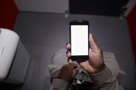 Top view closeup of unrecognizable African-American man using smartphone while sitting on toilet in public restroom, copy space