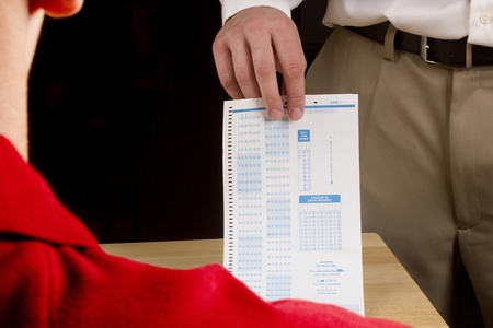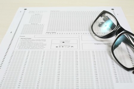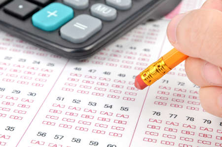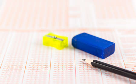 Pencil and eraser on answer sheets or Standardized test form with answers bubbled. multiple choice answer sheet