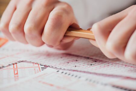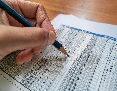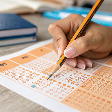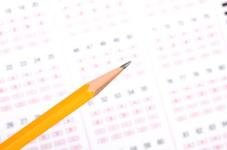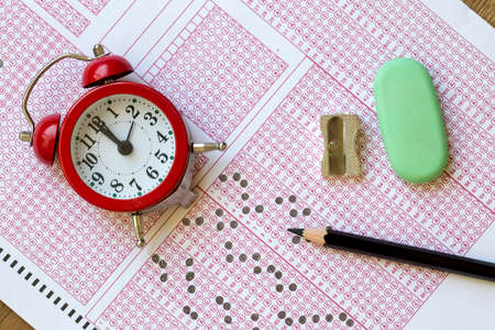 testing in exercise and exam paper. computer sheet with pencil in school test room, education concept. filling in answers in pencil