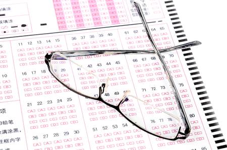 Picture of pen and glasses on the OMR sheet and OMR sheet on the clipboard.