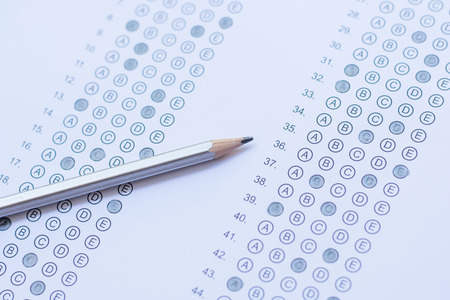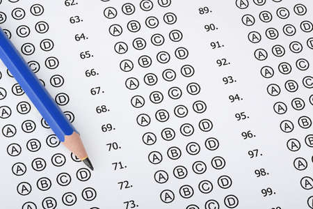 Exams quiz test paper with pencil drawing selected choice on answer sheets at school