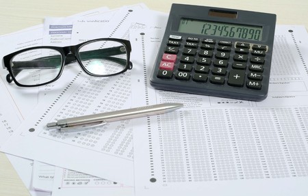 Picture of multiple omr sheet, pen, glasses and calculator. Isolated on white background.