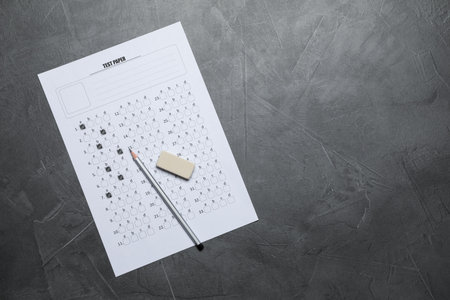 Standardized quiz or test score sheet with multiple choice answers pencil, and eraser.written mistake on a piece of paper, delete, correct, and mistake concept.
