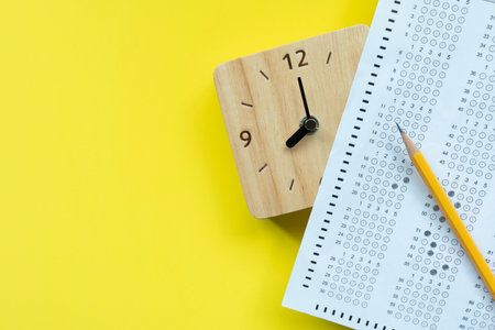 close up pencil and alarm clock on answer sheets with yellow background, education concept