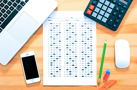 testing in exercise and exam paper. computer sheet with pencil in school test room, education concept