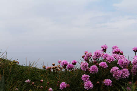 A small clump of sea Thrift clings precariously to the edge of rugged cliifs at Hushinish on the Isle of Harris in the Outer Hebrides of Scotland