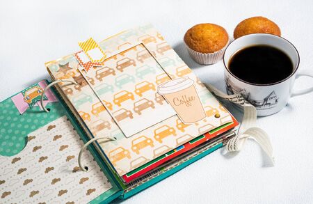 scrapbooking, photo album handmade cup of coffee with muffins on a white background