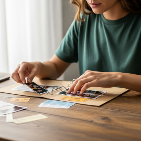 A woman engaged in creative scrapbooking at a wooden table surrounded by photos and materials in a cozy indoor workspace during daylight