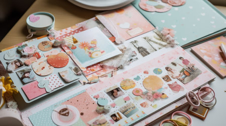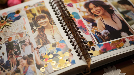 Scrapbook with photos and stickers. AI generated illustration