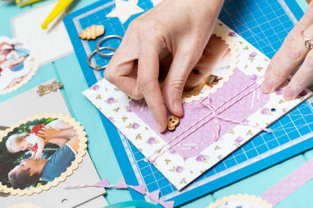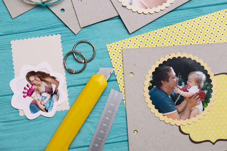 scrapbook background. the process of creating a childrens album. Card and tools with decoration