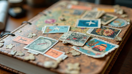 Vintage travel journal with decorative international postage stamps. That the image is generated using AI.