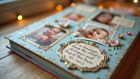 Decorative baby photo album with inspirational quote on a wooden table. That the image is generated using AI.