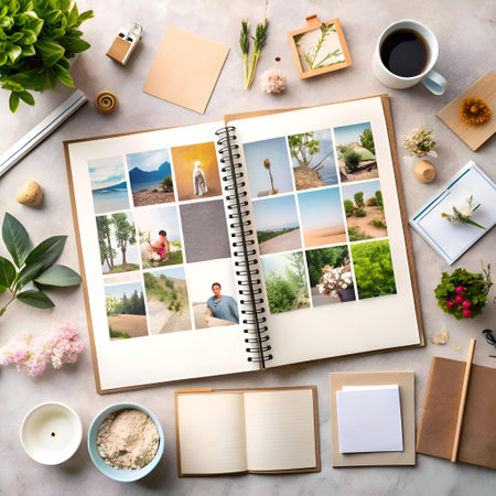 A flat lay image showcasing an open notebook with blank pages. surrounded by various objects including photos. flowers. and writing materials. Perfect for showcasing memories. creativity. and personal expression.
