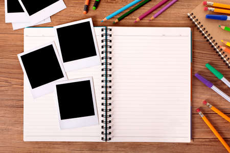 College student desk with blank photo album and several style instant photo print frames