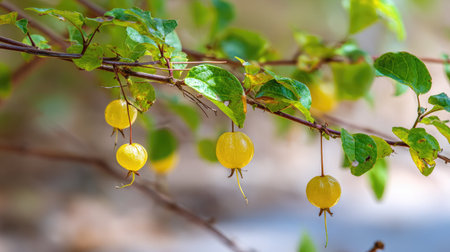 Close-up of several small, vibrant yellow berries hanging from a branch of a plant with green leaves. The berries appear ripe and freshly grown. The background is gently out of focus.