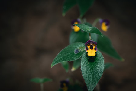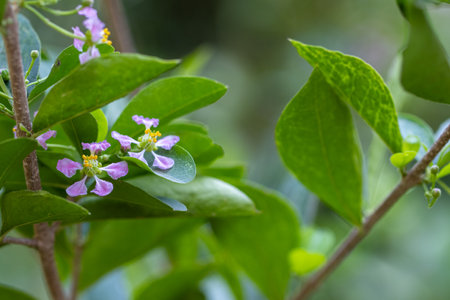 Close-up shot of vibrant green leaves with small delicate purple flowers, highlighting the natural beauty and detail of flora in a serene outdoor setting.