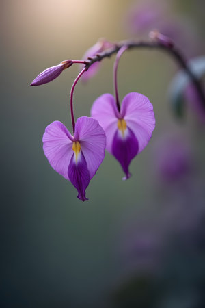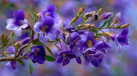 A stunning close-up of vibrant purple flowers blooming on a branch, showcasing delicate petals against a soft focus background that highlights natural beauty and tranquility.