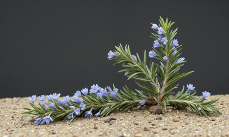 Australian native plant with tiny blue lillac flowers and spiky leaves shot at shallow depth of field