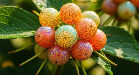 close-up photograph of small, green spheres with a textured surface, floating gracefully against a blurred background of green leaves.