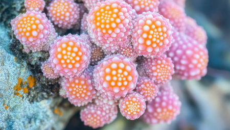 Close-up of coral-like growths on the surface, each with an orange and pink gradient and tiny white dots covering their surfaces. The plants have smooth, skin-like textures that resemble sea corals or flowers. They grow in clusters around stones or rocks, adding to their natural beauty. Captured with a Canon EOS camera and macro lens. --ar 53:30 --v 6.1 Job ID: 6e091cfb-14ed-48bc-bba8-fe4ba813dd4e