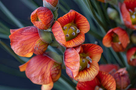 A close-up view of a bunch of striking orange flowers blooming in the Sturts Desert. The vivid petals stand out against the green foliage, showing the beauty of these desert blooms.