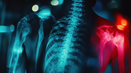 An X-ray of the shoulder, showing extreme pain in one joint. The focus is on an area where there's red and blue lighting indicating contouring to the hip bone structure. It captures detailed close-ups of both shoulders with clear, bright images. --chaos 30 --ar 16:9 --v 6.1 Job ID: c2e6312d-12a5-4b93-83ae-50e02c503477