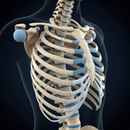 The focus is on the rib cage of a human skeleton highlighting the intricate details of the rib bones and the associated muscles