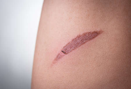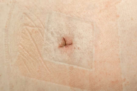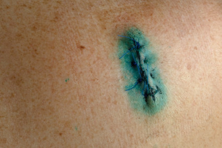 Suture wound treated with fucorcin after fracture of the right clavicle, one week after surgery, close up image