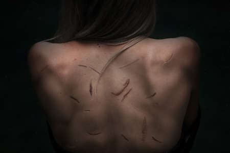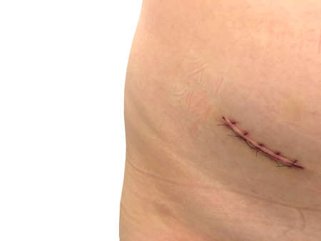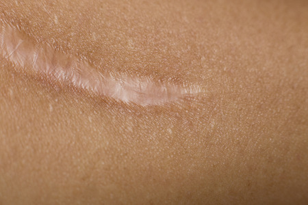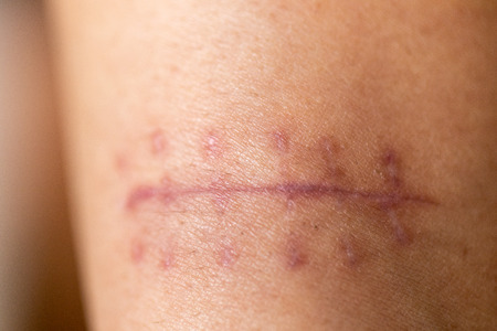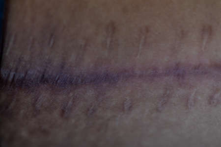 scar on body of survivor of a vicious attack, with stitches still visible, created with generative ai