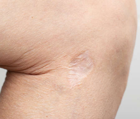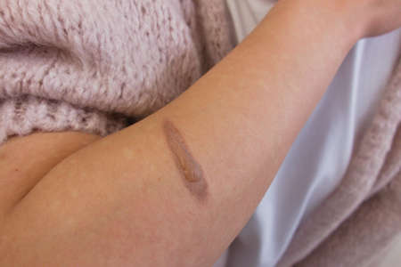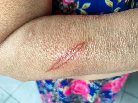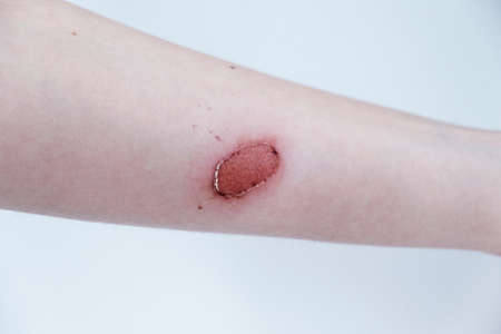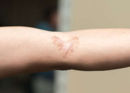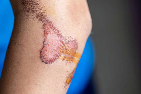 Close up of burn scar on a woman's hand. The skin damage in first-degree on outer layer skin. Healing, Removal Treatment and Accident. Scar and Wound Healing concept.