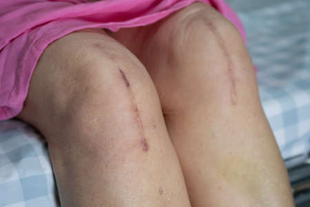 Asian senior or elderly old lady woman patient show her scars surgical total knee joint replacement Suture wound surgery arthroplasty on bed in nursing hospital ward, healthy strong medical concept.