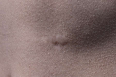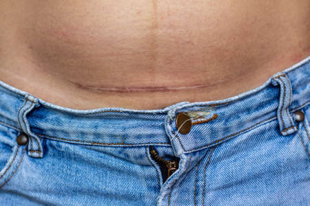 Scar on the skin. Abdomen of woman after the child birth by Cesarean section. Stretch marks after pregnancy. Navel hernia. White line diastasis. close-up. Lymph flow violation and fluid stagnation.
