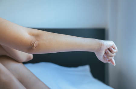 Close up of woman with dry skin on elbow and arm,Body and health care concept,Selective focus