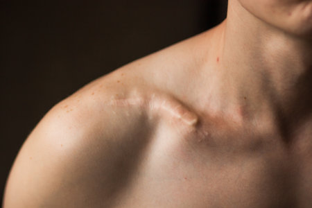 Closeup of surgical scar on the shoulder of a man following ORIF operation to repair a broken clavicle